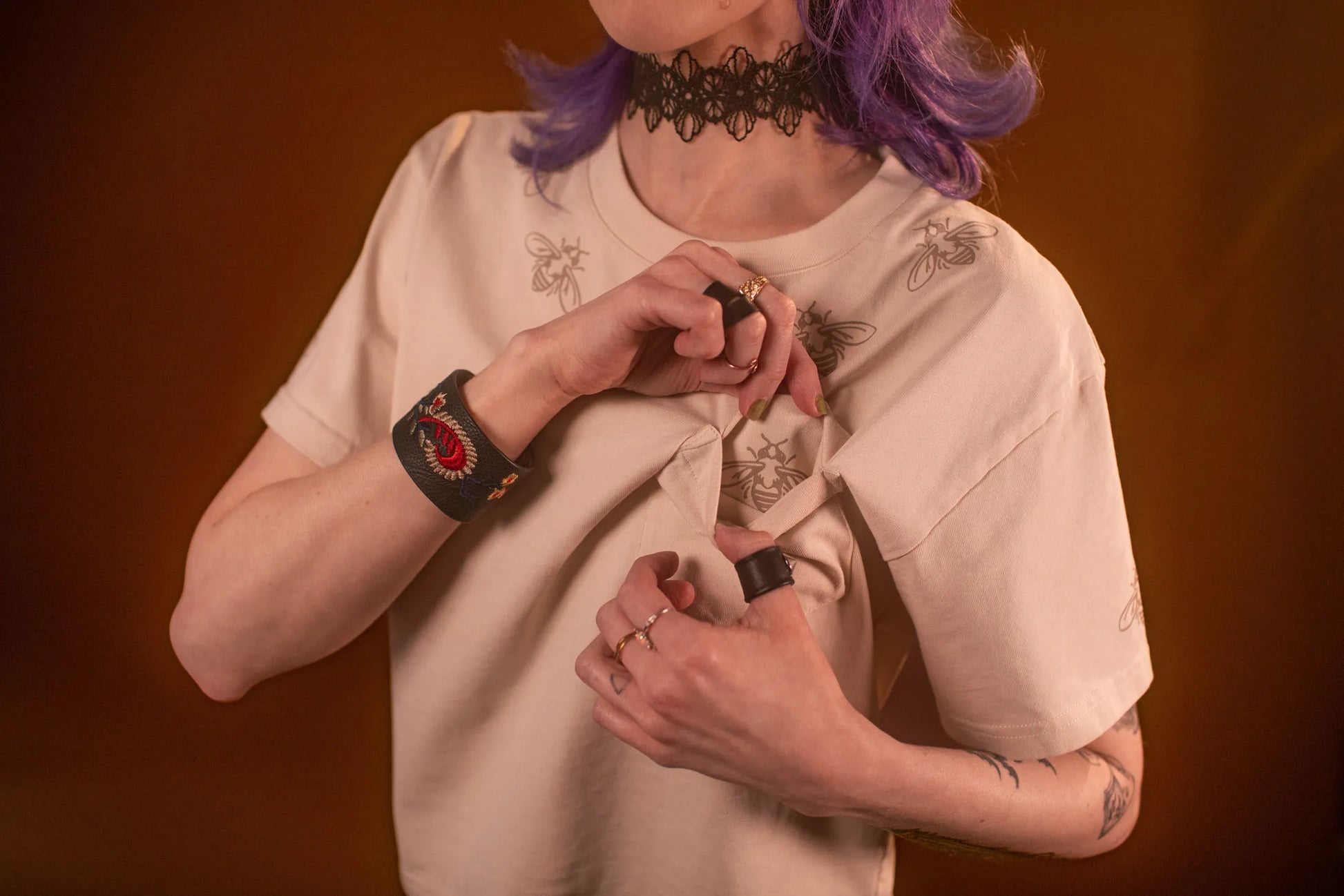 A simple crop top with bee-youtiful origins, this tee keeps you looking and feeling cool. Screen printed bees work in harmony, as directed by their hidden queen...
