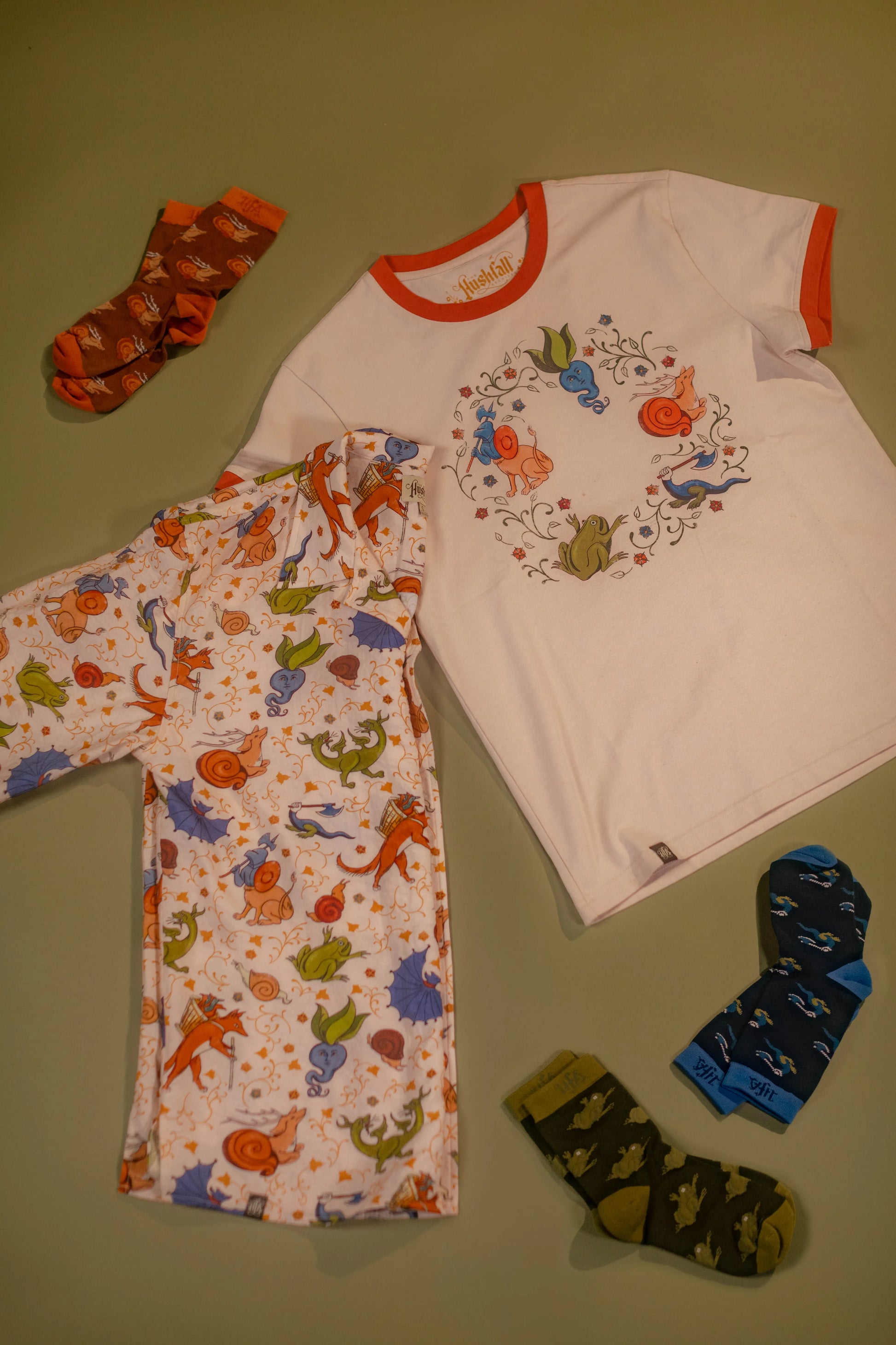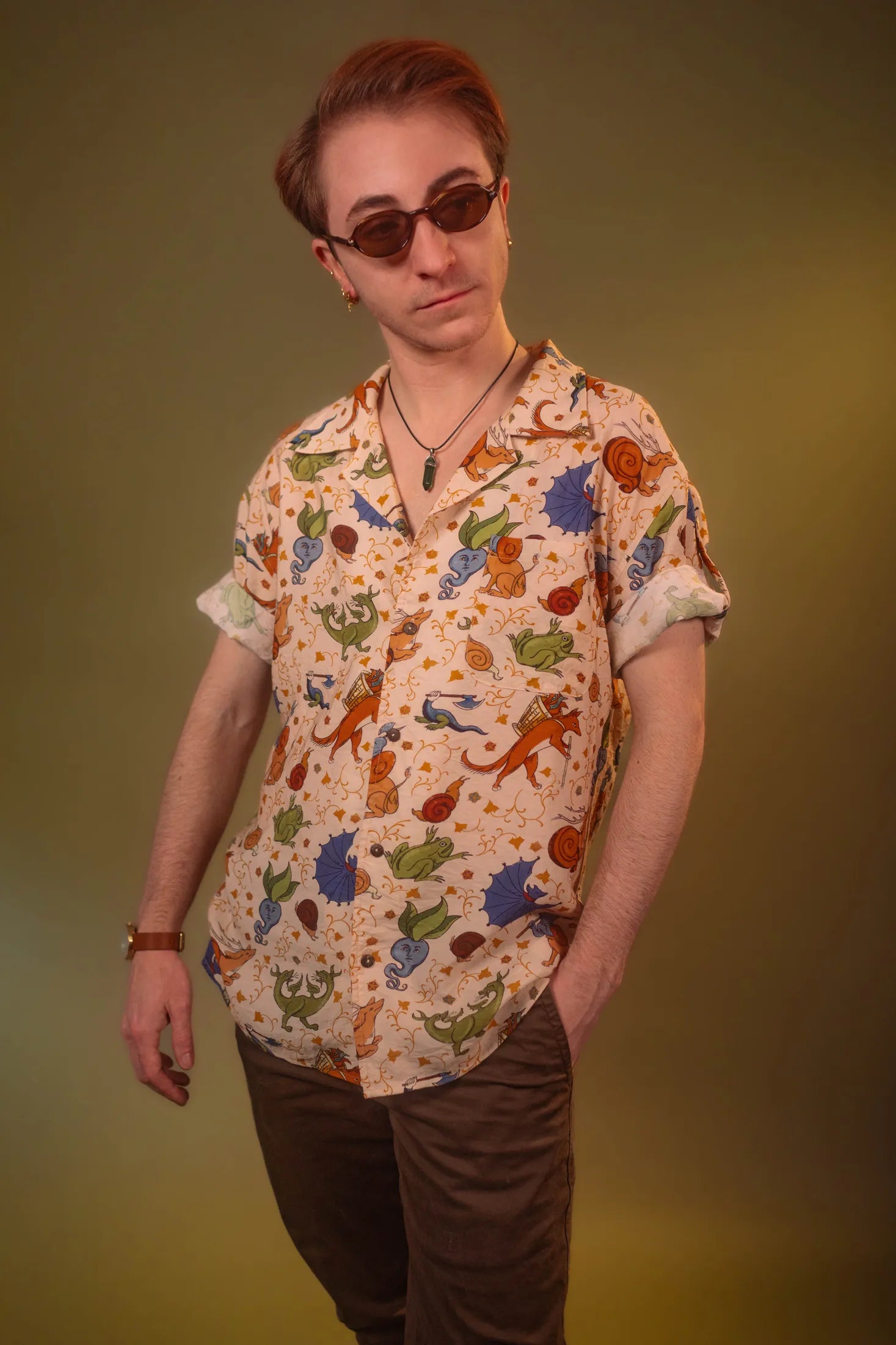 Get whimsical with it in this cotton-tencel camp collar shirt. Silly creatures from the margins of medieval manuscripts, sourced between the 14th and 15th centuries, adorn breezy fabric designed to keep you cool and comfortable. Generous sleeves can be worn up or down with built-in roll-tab design. Medieval creatures sourced from actual manuscripts, illustrated in tandem by our Artisan and Caitlyn Bidwell. Pairs wonderfully with our Illuminated Corduroy Overshirt.
