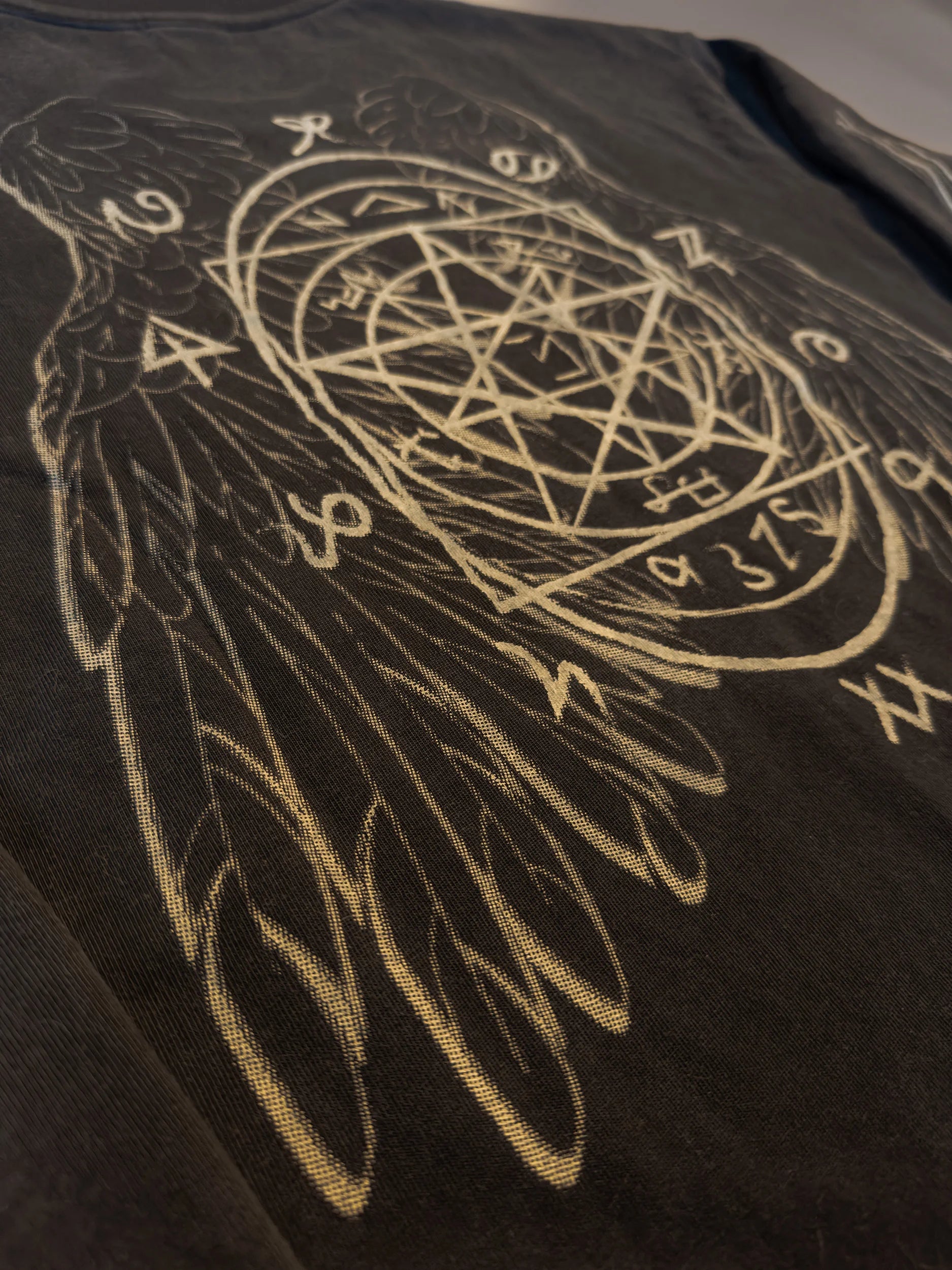 Engulfed in Enochian runes, this long sleeve tee wards off even the most arch of angels. All sigils combined repel seraphim of all types, and a blade down the sleeve keeps you armed in the apocalypse. Soft, sturdy cotton lives through any sticky situation. Part of our Angel Bundle.