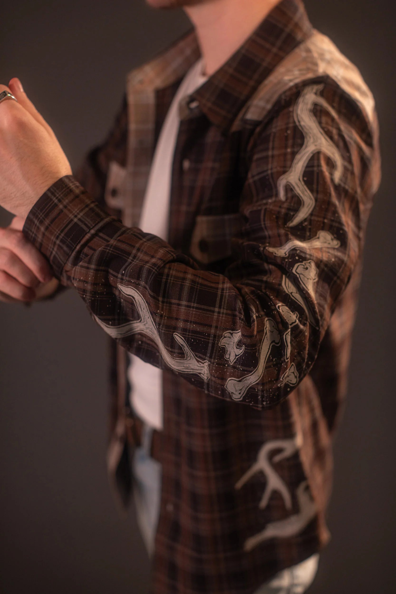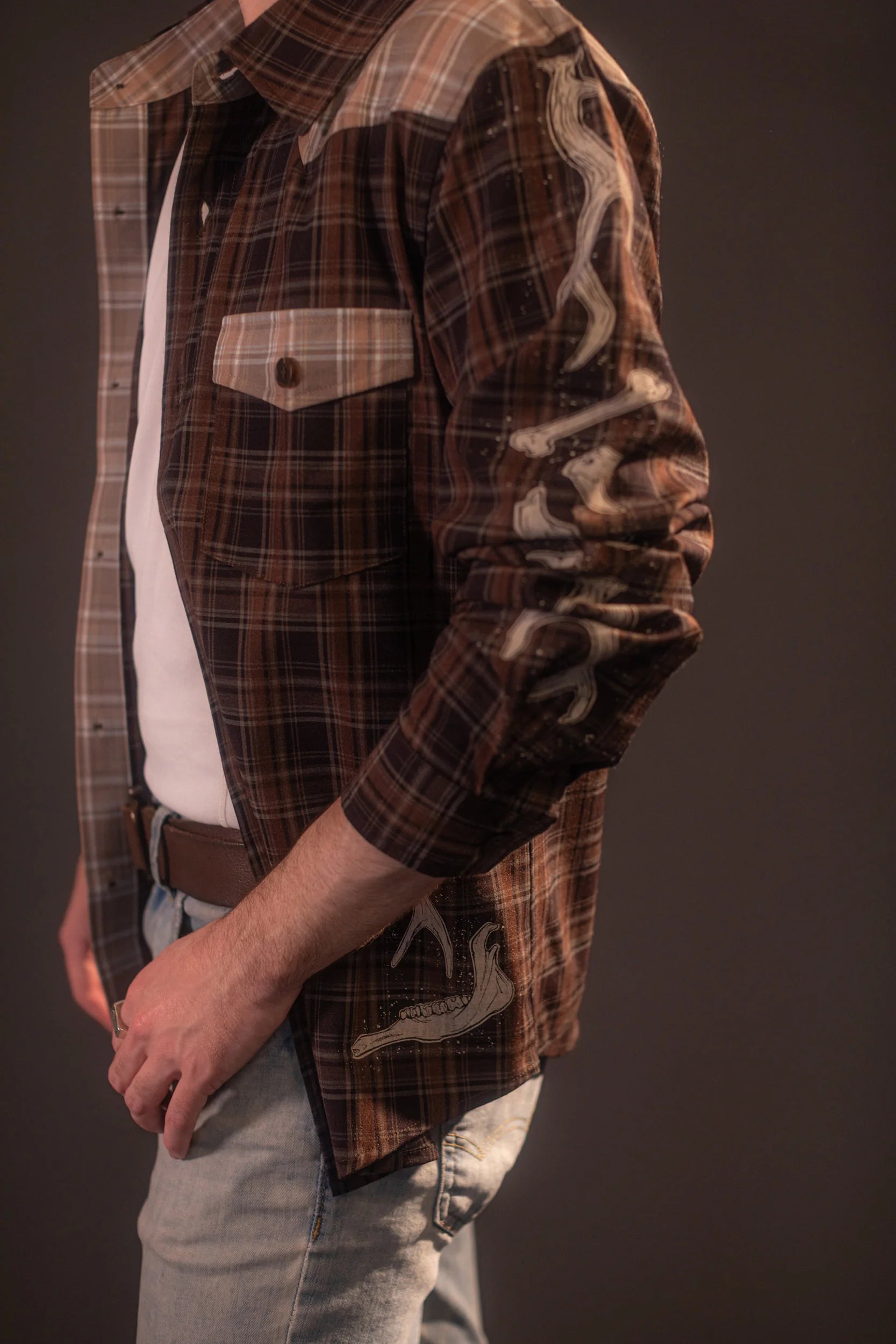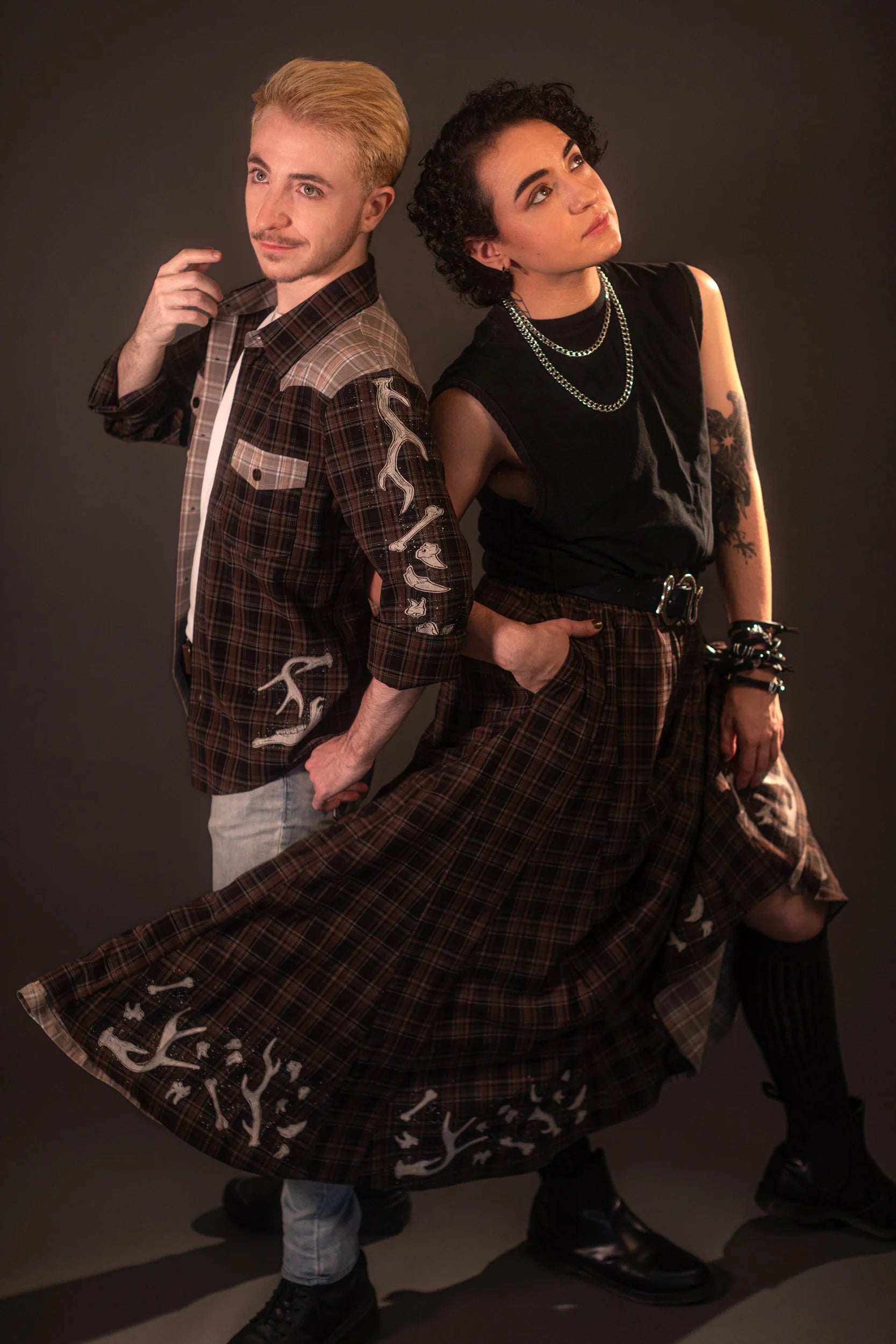 We do bones. Curated bone collections decorate sleeves, yoke, and hemline. Lightweight, breathable plaid, perfect for layering. Looking to match with your final girl? Check out the Bone Collector Skirt! Part of the Hunter Bundle.