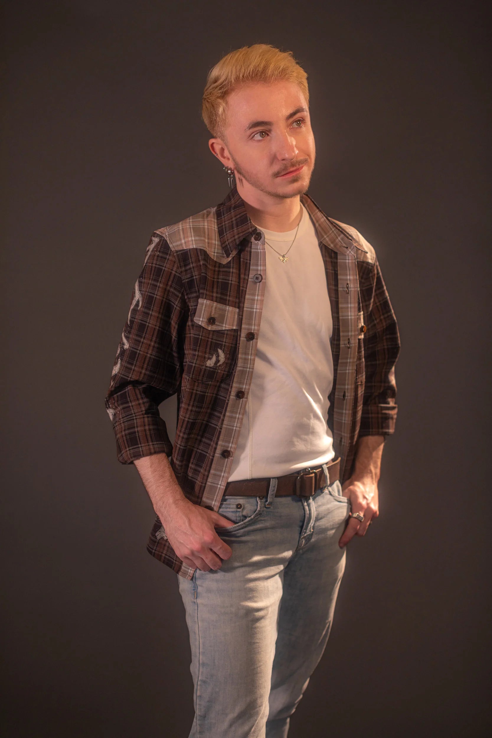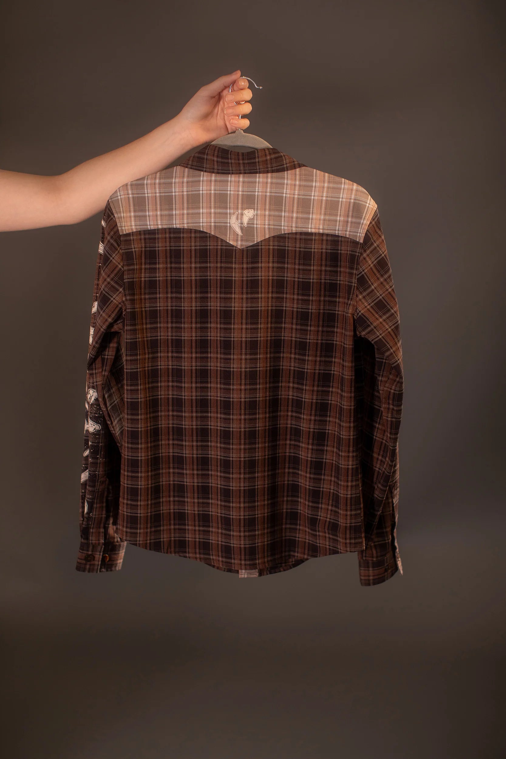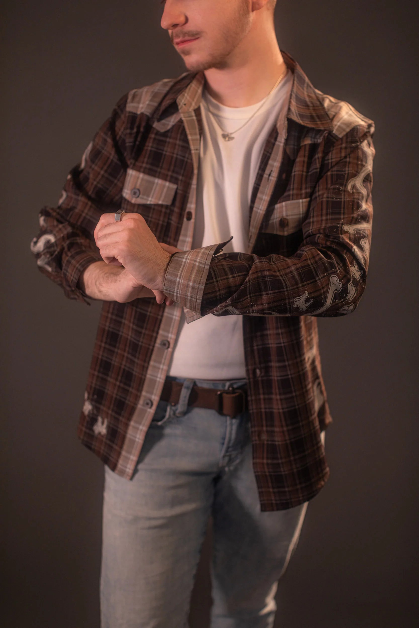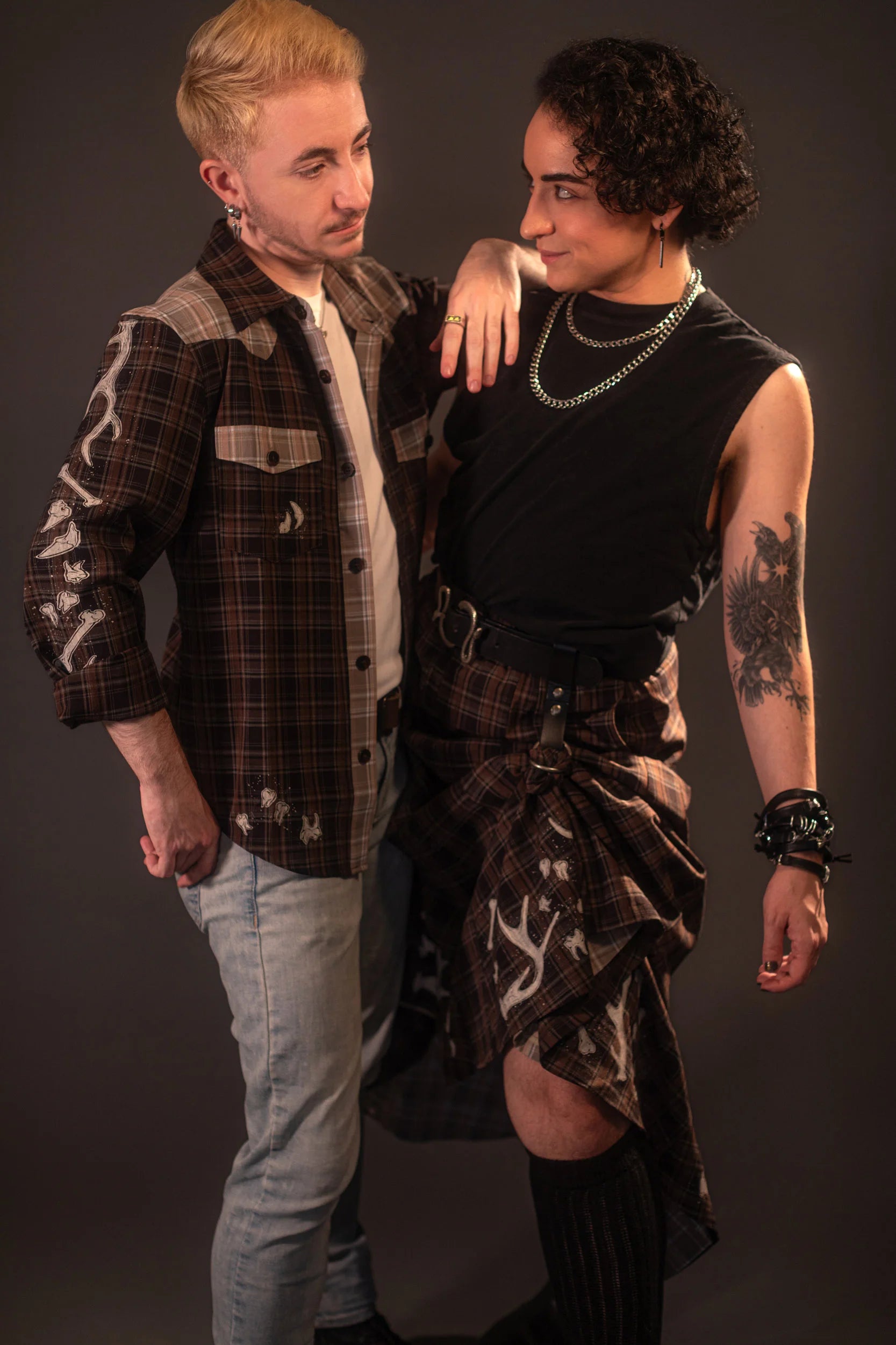 We do bones. Curated bone collections decorate sleeves, yoke, and hemline. Lightweight, breathable plaid, perfect for layering. Looking to match with your final girl? Check out the Bone Collector Skirt! Part of the Hunter Bundle.