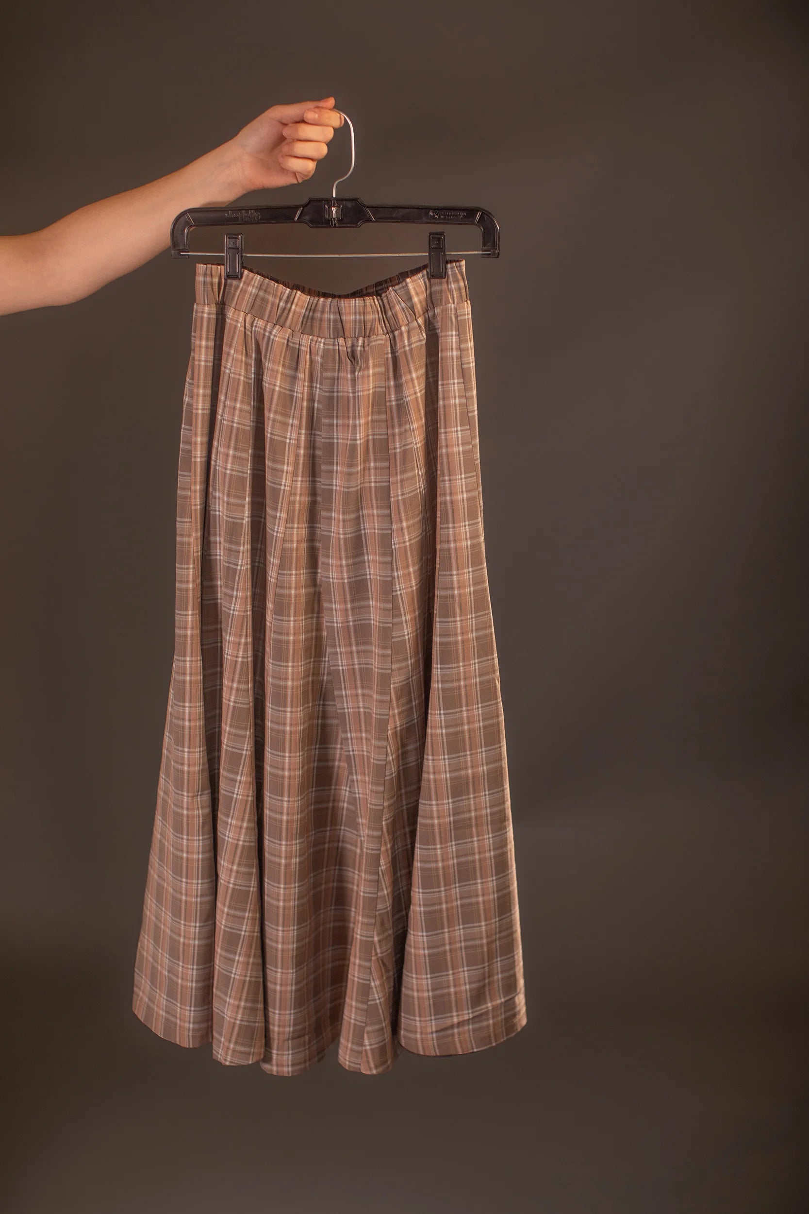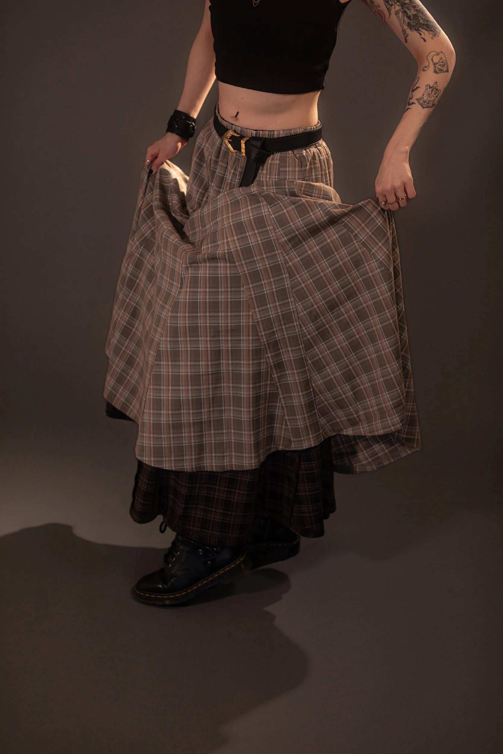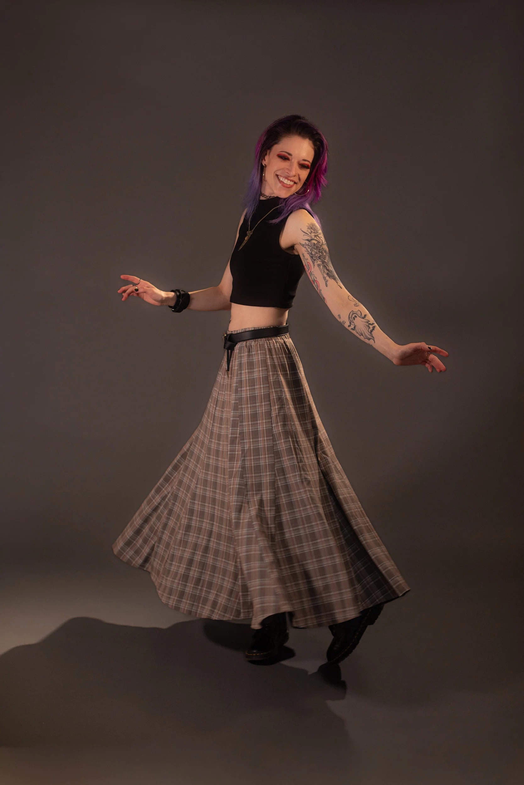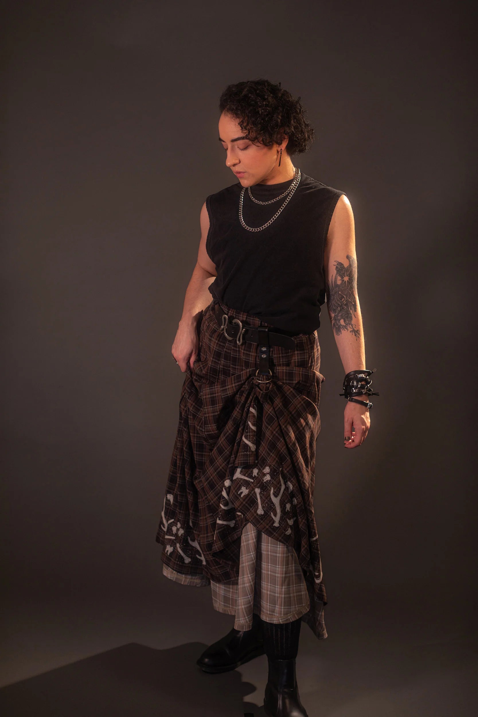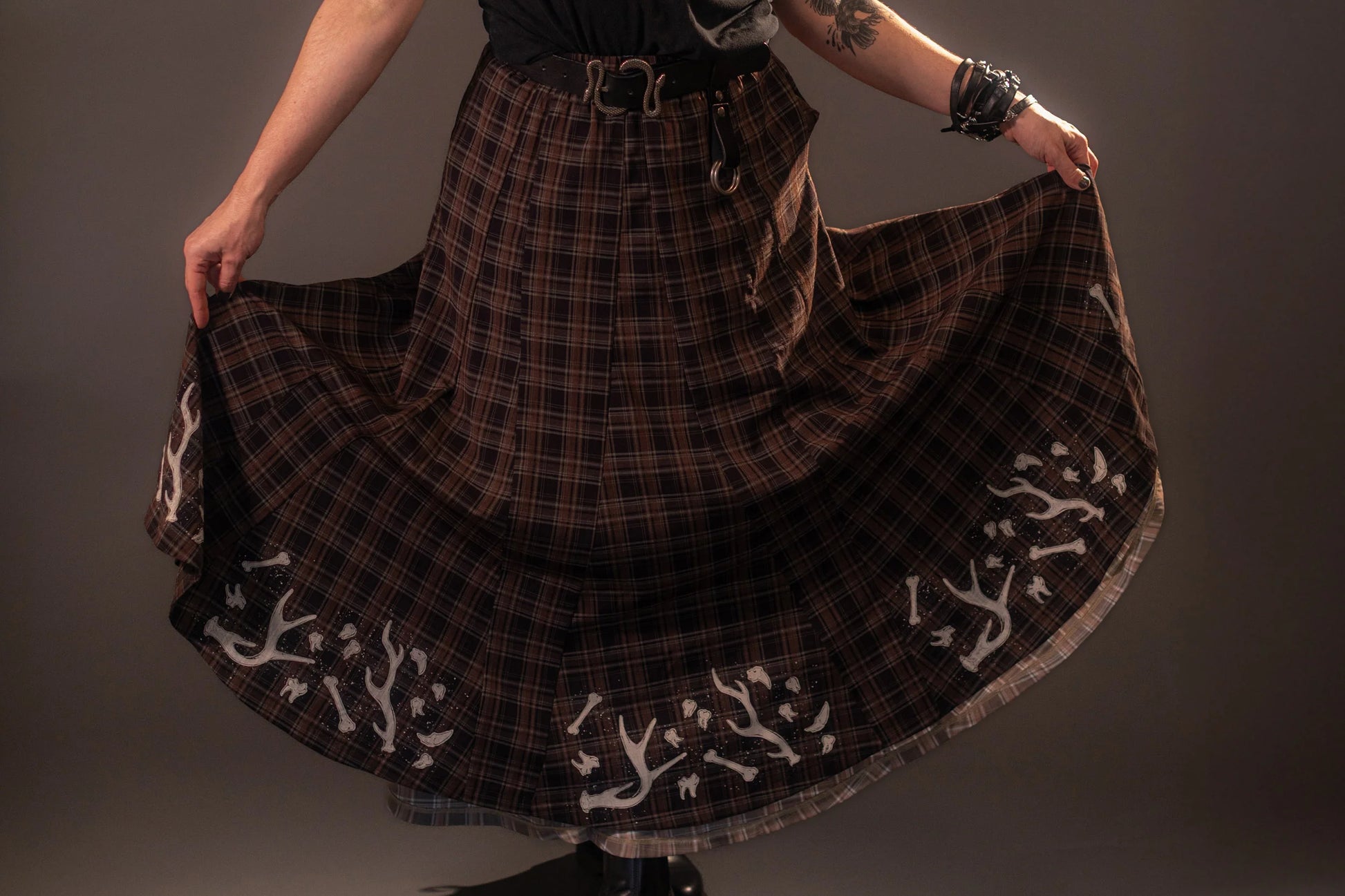 Yes, it has pockets. Ten gores swirl around this fully reversible plaid skirt, with discharge printed bones along the hem. Fancy a trip to the light side? Simply reverse the skirt for a versatile look in light grey and taupe. Matches our Bone Collector Button Up.