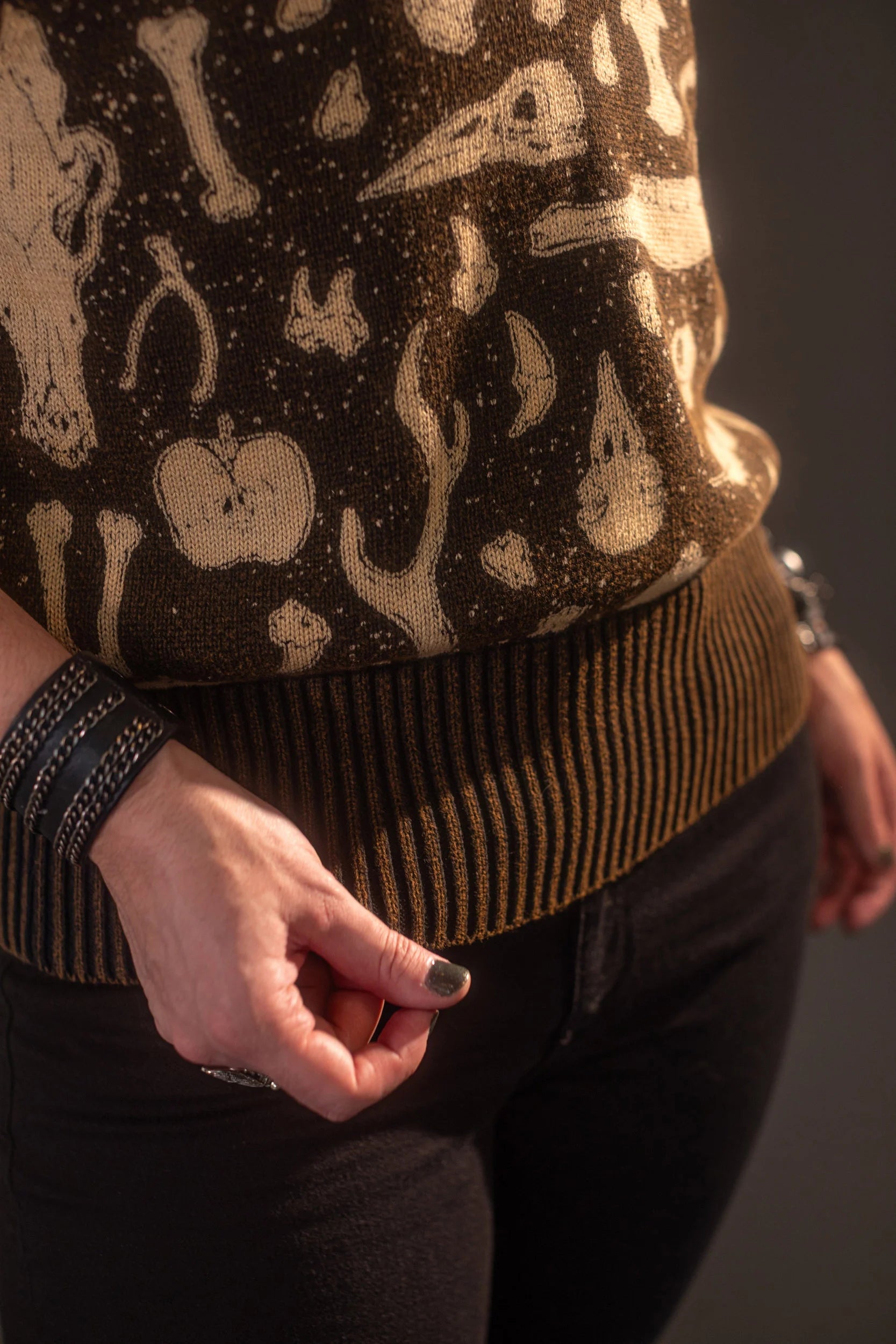 Scholastic style for the spooky subjects. Cotton knit sweater vest started all black, but was discharge printed and acid washed to reveal all-over bones, skulls, and teeth. This hi-fidelity pattern will be with you 'till death.
